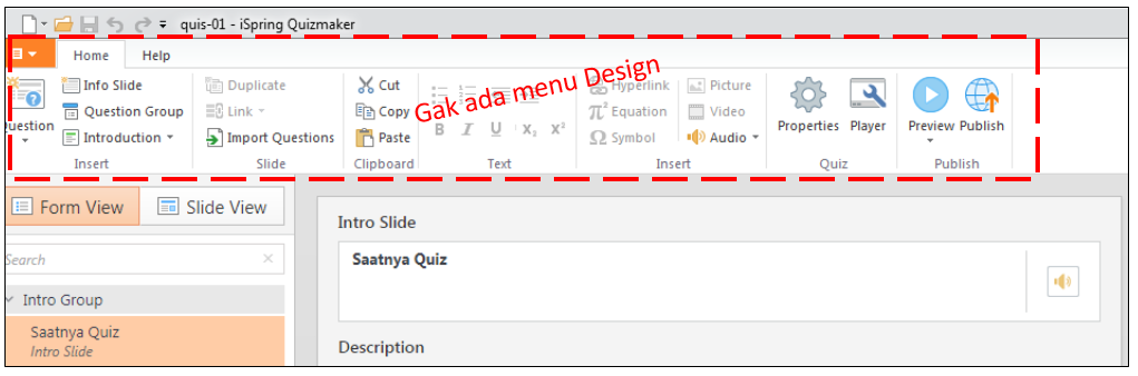 Menu ganti background quiz iSpring versi 9 terletak di tab menu Design.Sobat pasti akan kebingunan. Karena tampilan default, tidak menunjukkan menu Design.
